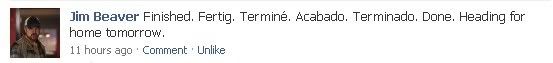 “Jim Beaver Finished. Fertig. Terminé. Acabado. Terminado. Done. Heading for home tomorrow.“